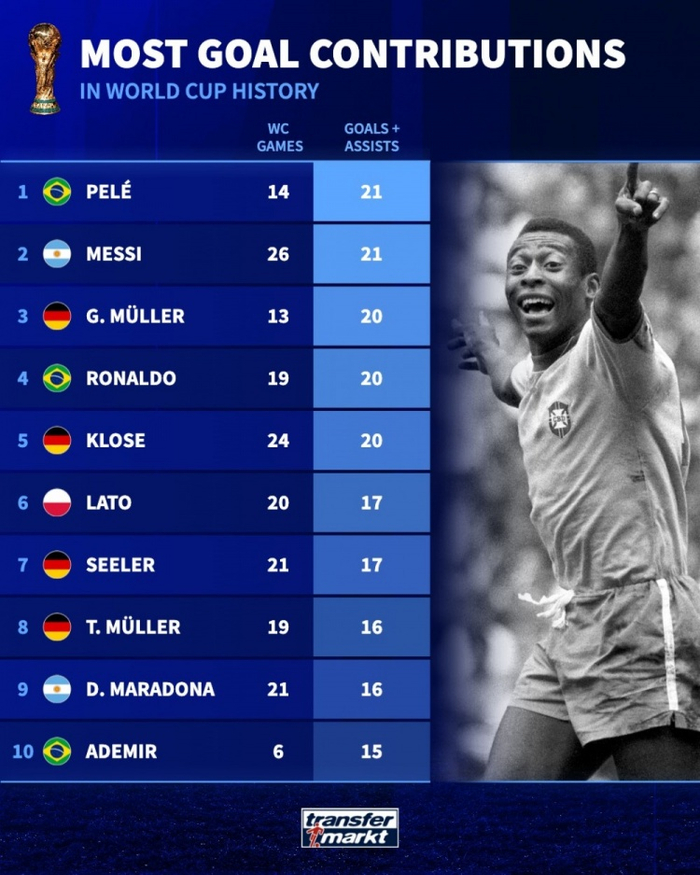 世界杯参与进球榜:贝利与梅西双雄并列第一